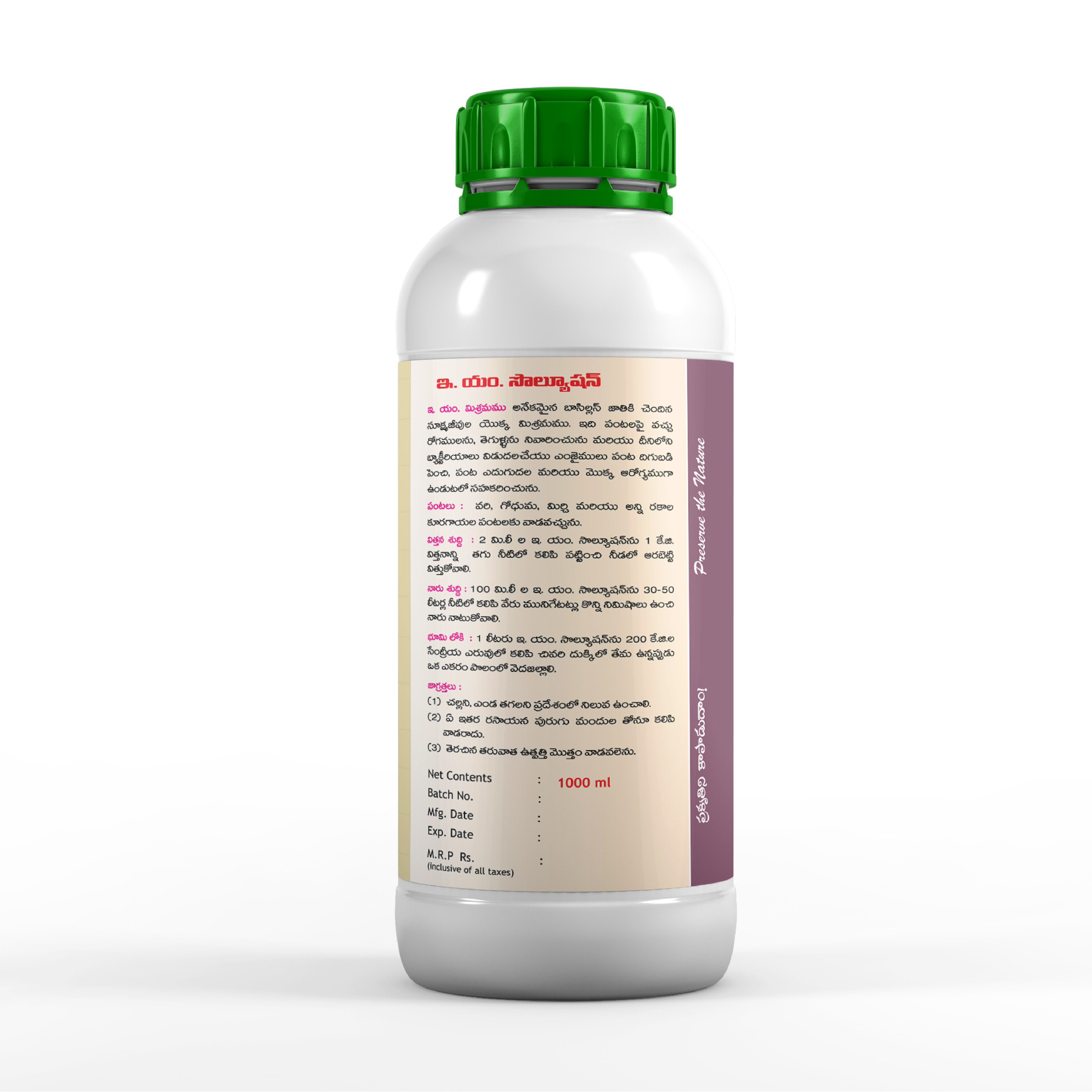 Seedling Treatment:Take 3 ml of E.M. Solution per 1 kg of seed mix in sufficient water, then dry the seeds in shade before sowing. For seedlings, take 100 ml per 30 litres of water, mix thoroughly, then dip the seedlings for a few minutes, then transplant in the field.